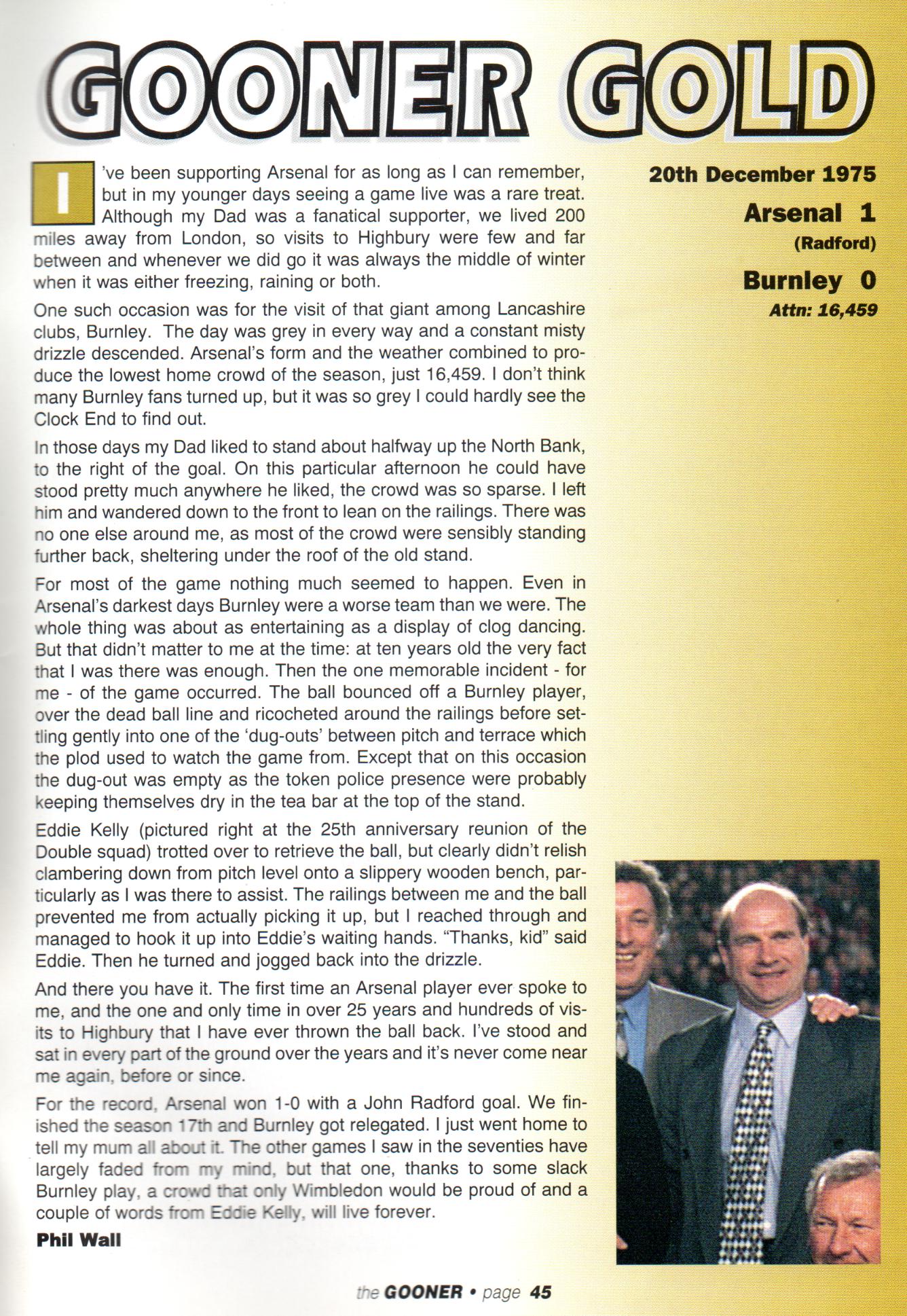 For the record, Arsenal won 1-0 with a John Radford goal. We finished the season 17th and Burnley got relegated. I just went home to tell my mum all about it. The other games I saw in the seventies have largely faded from my mind, but that one, thanks to some slack Burnley play, a crowd that only Wimbledon would be proud of and a couple of words from Eddie Kelly, will live forever.
