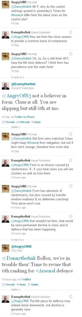 But Arsenal at the moment – well, that doesn’t look entirely random to me. So I tweeted back: “Form has elements of randomness, but [in Arsenal’s case is] also caused by transfer window madness & no defensive coaching! Time alone won’t cure [it].”