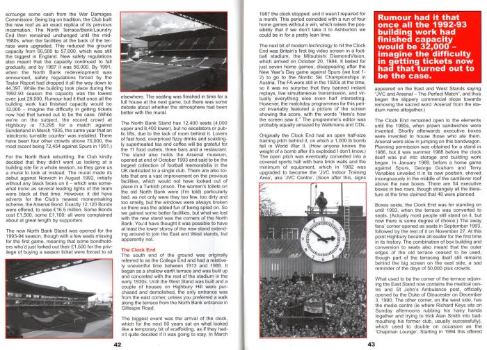 Boxes aside, the Clock End was for standing on until 1993, when the terrace was converted to seats. (Actually most people still stand on it, but now there is some degree of choice.) The away fans corner opened as seats in September 1993, followed by the rest of it on November 27. At this point Highbury became all-seater for the first time in its history. The combination of box building and conversion to seats also meant that the outer edges of the old terrace ceased to be used, though part of the terracing itself still remains behind the big screen on the east side, a sad reminder of the days of 50,000 plus crowds.