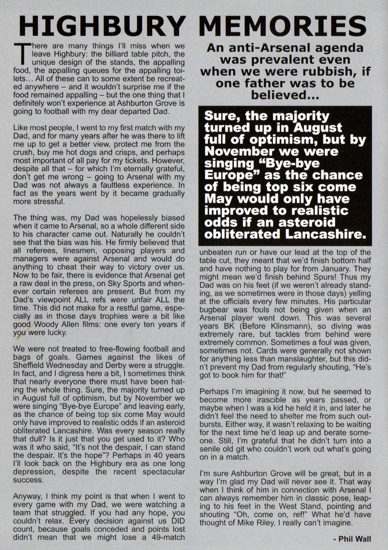 Talking of bias, as I was last night, one Arsenal fan I knew very well was hopelessly biased and yet always thought it was everyone else’s problem. Here’s a piece from The Gooner issue 153 in January 2005, as our time at Highbury was coming to a close: a tribute (sort of) to my late father.