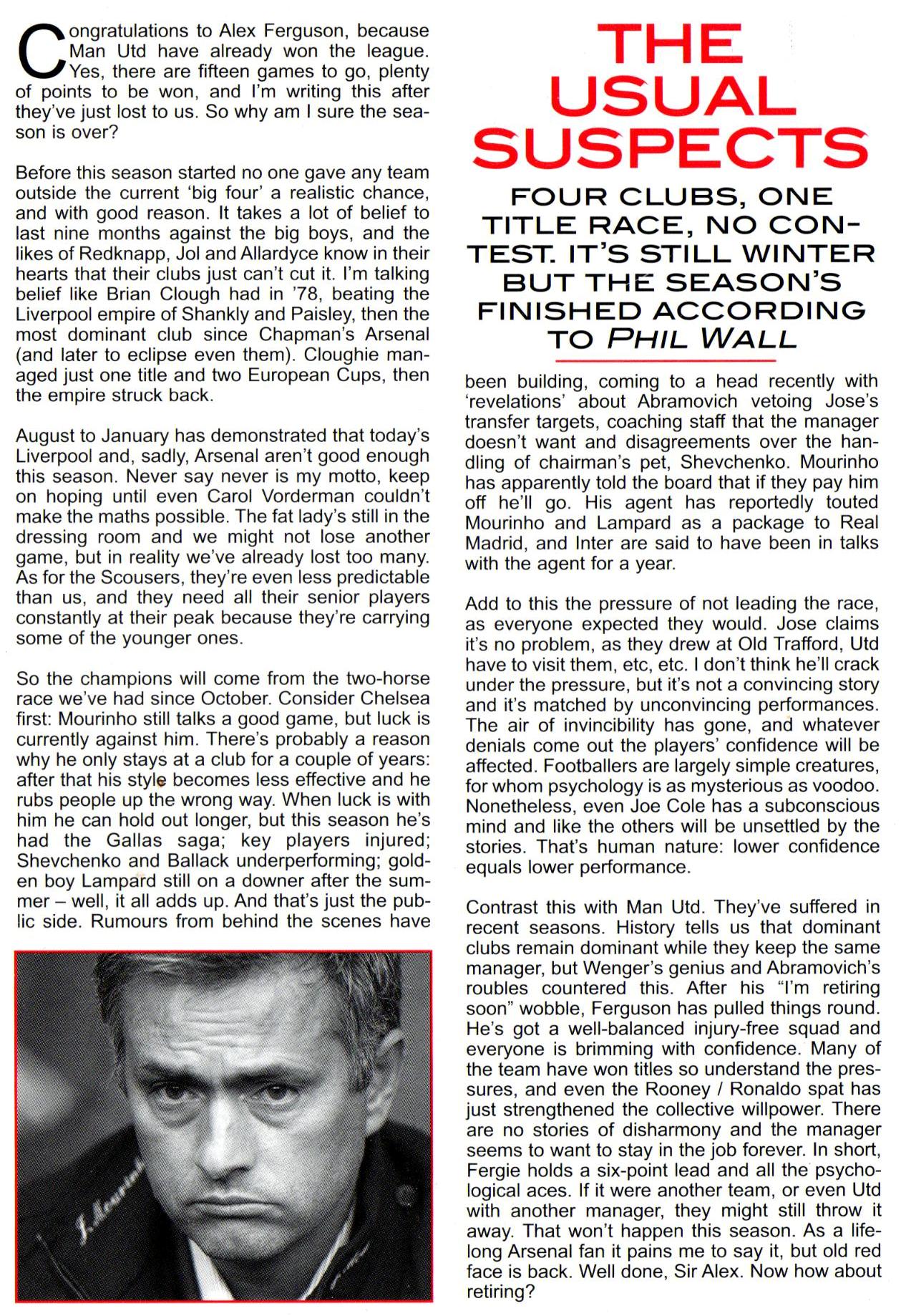Why am I telling you this? Firstly to put the prediction on record, and secondly as an excuse to post another on my old articles from The Gooner. I made the same prediction in January 2007 that Man Utd would end the season as Champions, when they were in a two horse race with Chelsea. (At the time, Liverpool were still considered one of the ‘Big 4’ – how times change.) I was right then, with almost four months of the season and 15 games to go, so surely I’m right this time, with only ten games left?