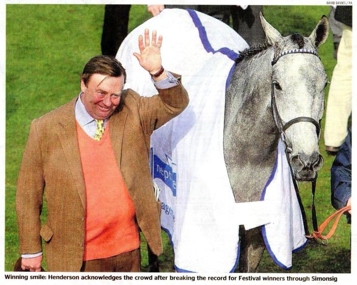 Horseracing is the only sport that exists purely to sustain a betting industry. Maybe that’s why the people involved can be quite odd – John McCririck for example. But I am fascinated by this picture of trainer Nicky Henderson – has an expression ever said ‘Nice but dim’ any more clearly than this? The horse looks like Einstein by comparison.