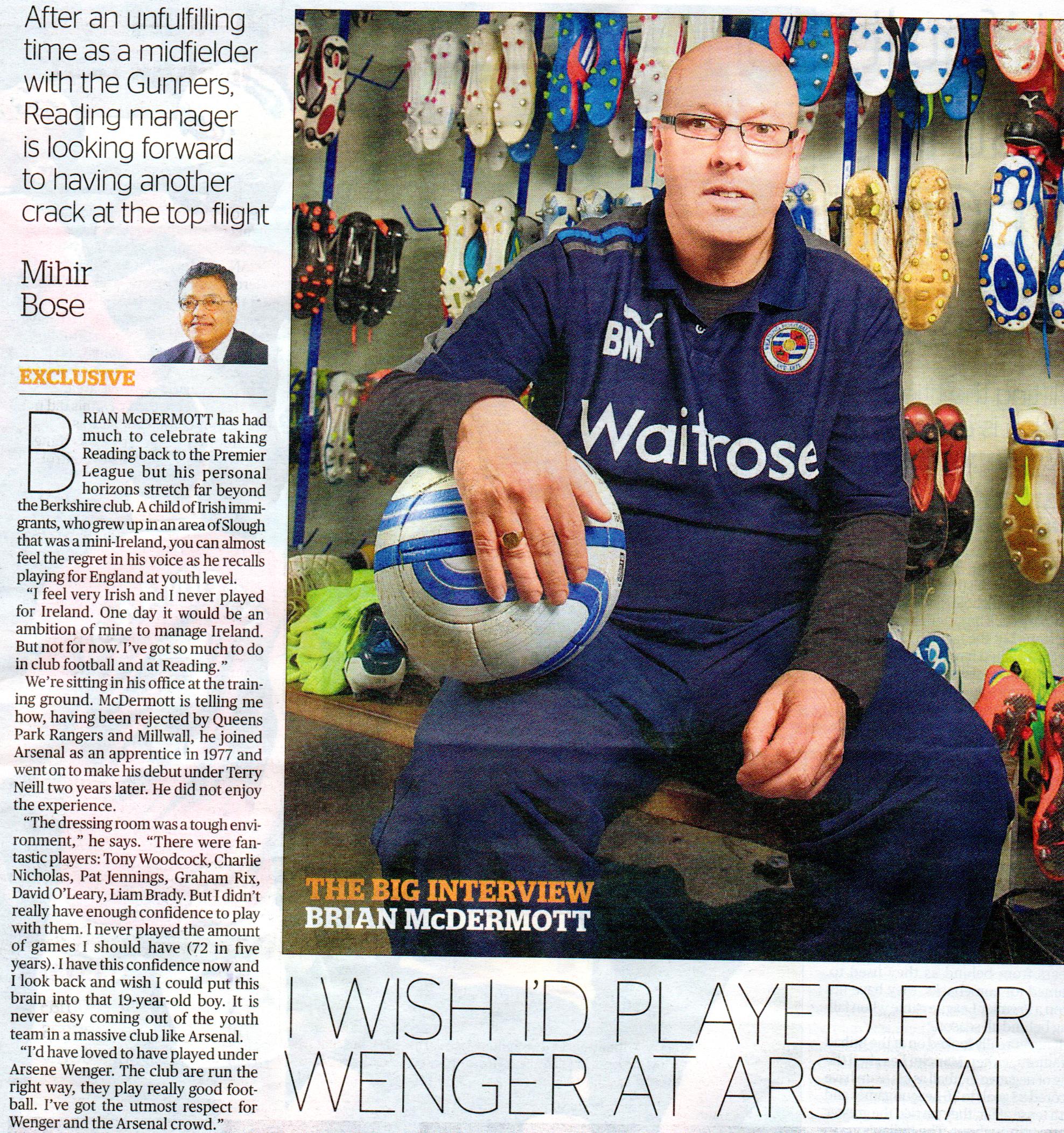Former Gunner Brian McDermott, now manager of Reading and amateur Matt Lucas-alike, is interviewed in the London Evening Standard today. The interview is by Mihir Bose, who is not only a Spurs fan but normally dimmer than a three watt bulb. On this occasion he has started his piece with the important stuff, though: McDermott’s time at Arsenal.
