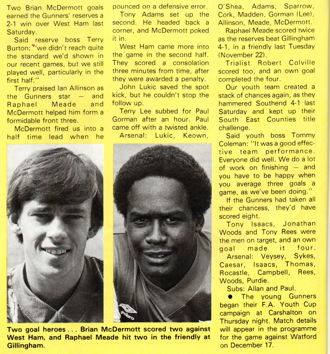 By way of pictorial comparison, here’s a report from the Arsenal programme in December 1983, a year where McDermott had already been loaned out to Fulham and IFK Norrkoping of Sweden after losing his first team place. A more hirsute Brian is pictured alongside Raphael Meade (Raph giving Gervinho a good run in the forehead department) after scoring both Arsenal goals in a reserve match against West Ham. Brian has borrowed that hair from Charlie Nicholas, I think. The Arsenal reserve team for the West Ham match also featured John Lukic, Martin Keown, Tony Adams and Ian Allinson, among others. Meanwhile the youth team the same week featured Michael Thomas, David Rocastle and Gus Caesar.