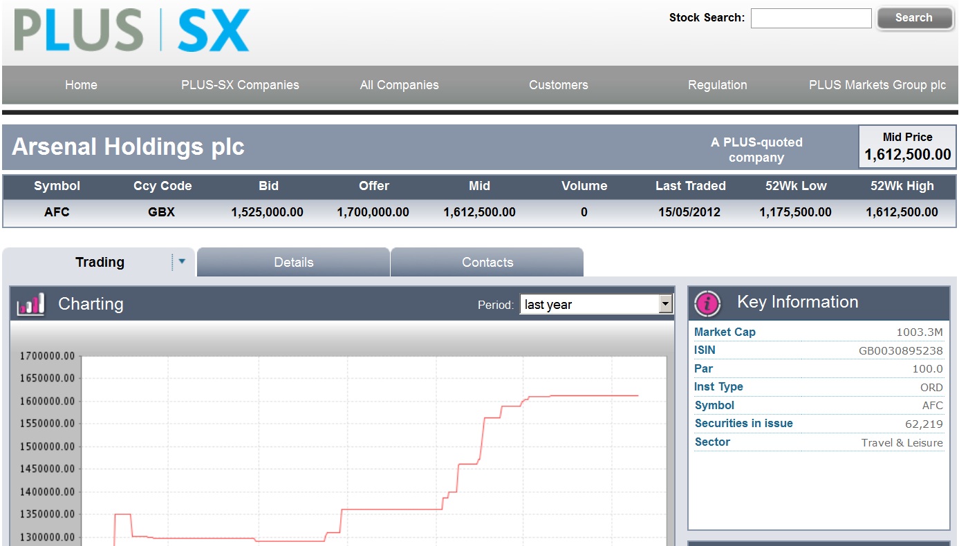 Arsenal shares are currently traded on Plus Markets Group’s ‘PLUS-SX’ stock exchange, which describes itself as “a London-based stock exchange providing cash trading and listing, derivatives and technology services.” Plus Markets also says it “delivers product innovation and competitive pricing to market participants by operating a low cost base RIE [Recognised Investment Exchange]. PLUS offers a neutral trading environment, wholly independent of any market user.” More simply, it provides an alternative to a full stock exchange listing for around 150 smaller companies such as Arsenal and the brewer Adnams.