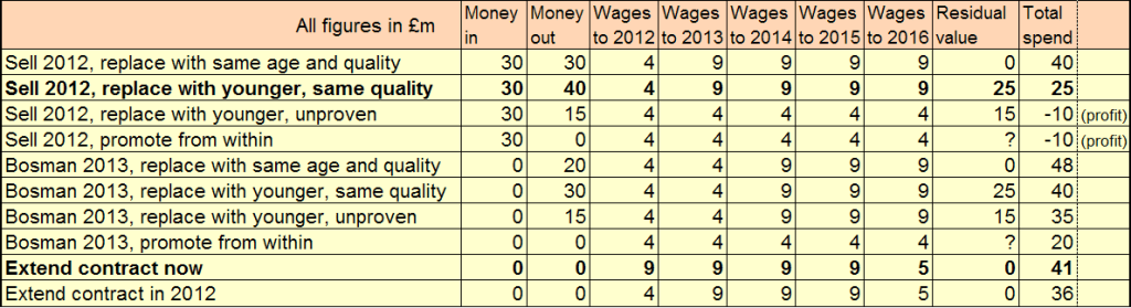 So where does all that leave us? It left me scratching my head, so I made a table of how costs could work out depending on any of 10 options. I was obviously making estimates and assumptions on all these, such as how much replacements would cost and be paid, but I think it’s all reasonable, within a million or five. As time has moved on we can ignore the ‘Wages to 2012’ column, and to be honest I’d be surprised if we can sell him for anywhere near £30m. However, if we buy a younger replacement for whatever we get or even five million more it’s still good.