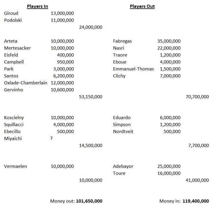 At the start of the year both the AST and Swiss Ramble concluded that Arsenal had some money to spend, given the state of the accounts and the comings and goings last summer. There may not have been exact agreement on the amount, but there was a ballpark figure of about £50m. Let’s call it that; it’s a round number. And if you look at the transfers in and out for the last few years the picture supports a figure of £50m quite well. Since 2008, and including the signings of Podolski and Giroud this summer, Arsenal have made a profit on transfers of just under £20m. Before the latest purchases, it was a bit over £40m. And this includes the big sales of Fabregas, Nasri, Adebayor and Toure, all as much or more than we have ever paid for a single player. This always seems to surprise people who think we make a vast profit year after year on transfers that never gets spent. But look at the table of paid transfers since 2008 – £119m in and close to £102m out – and that doesn’t include Miyaichi, who never has a fee quoted though it seems unlikely he was free.