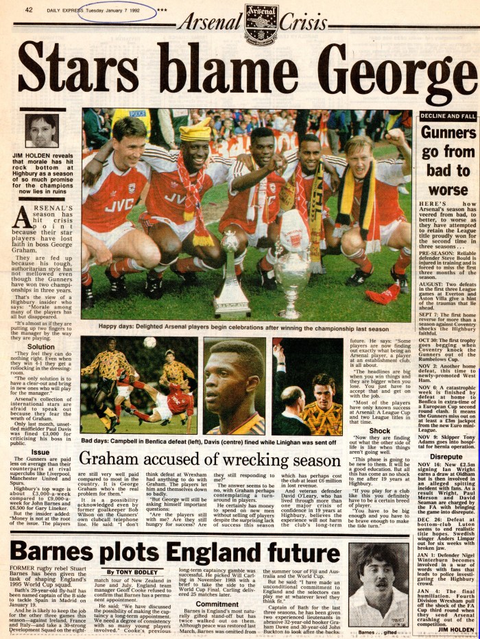 The papers love nothing more than an ‘Arsenal in Crisis’ story. Here’s one from January 1992, just days after the Gunners were knocked out of the FA Cup by Fourth Dvision Wrexham. The blame for the poor season is laid squarely at the feet of manager George Graham.