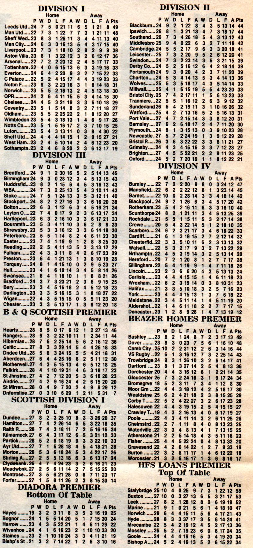 A look at the league table from the same day shows Arsenal, defending champions of course, in seventh place and well off the pace. They’re ahead of rival ‘superclub’ Tottenham only on goal difference, but of course there was no similar ‘Spurs Crisis’ headline because no one realistically expects Spurs to actually challenge for the title. Leeds and Man Utd were slugging it out at the top, while Blackburn were in Division Two, having only just started spending Jack Walker’s millions. This of course was the last season of the old league structure before the Premier League began and the lower divisions got renamed to their current daft format.