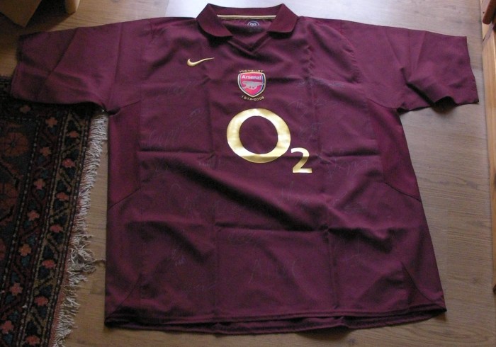 I’ve had enough of Spurs fans’ abuse now after a couple of days of it, so here’s something different. I’m getting close to 5,000 followers on twitter, so when I get there I’ll give away this Arsenal shirt from 2006. As you can see, it’s the redcurrant ‘last season at Highbury’ special. There is no name or number on the back. Click the picture to enlarge it and you’ll see that it’s signed (allegedly) by the 2006 Arsenal squad and manager.