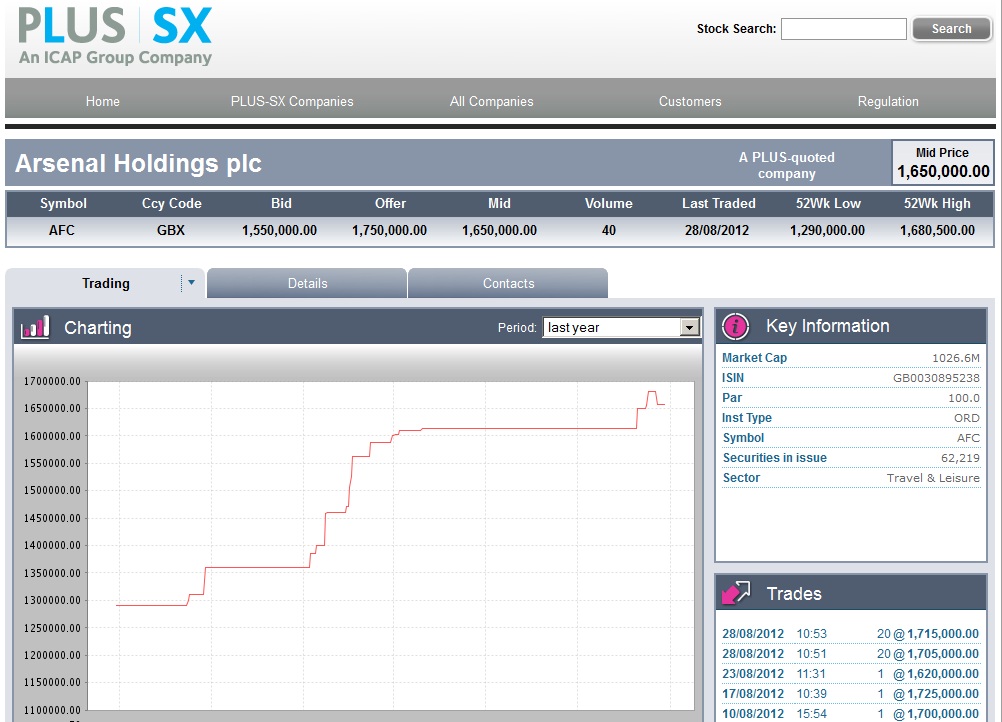 On 28 August 40 Arsenal shares were traded on Plus Markets, 20 at £17,050 each and another 20 at £17,150 each (the record high price is currently £17,250 per share).