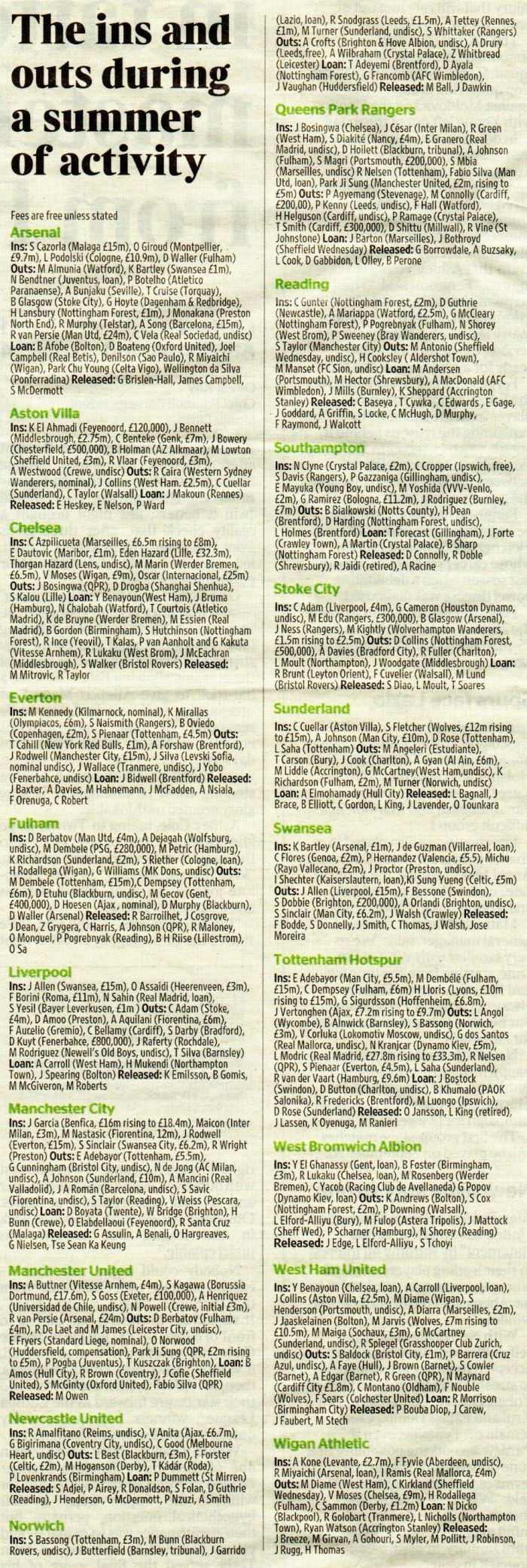 All PL Transfers in Summer 2012 Phil / September 11, 2012 All the transfers to and from every club in the Premier League in Summer 2012, courtesy of The Times. Twitter: @AngryOfN5 Share this: Click to share on X (Opens in new window) X Click to share on Facebook (Opens in new window) Facebook Click to share on Reddit (Opens in new window) Reddit Click to share on LinkedIn (Opens in new window) LinkedIn Click to share on Tumblr (Opens in new window) Tumblr Click to share on Pinterest (Opens in new window) Pinterest Like Loading...