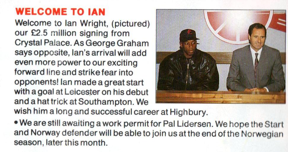 Next week sees the 21st anniversary of Ian Wright signing for Arsenal. This is the rather low-key announcement from the following week’s programme: