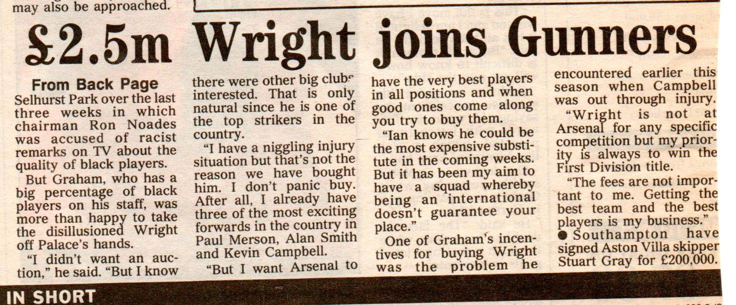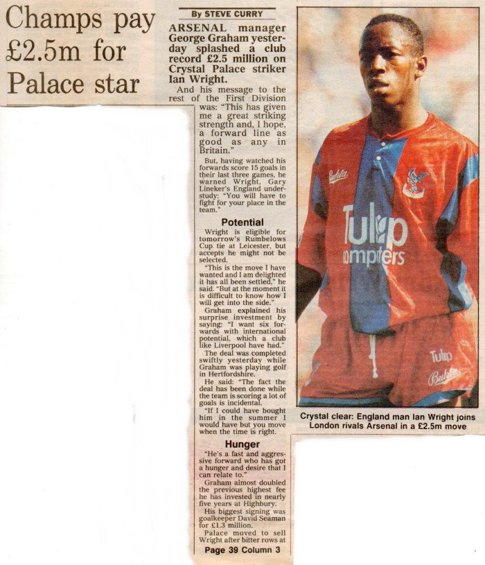Here’s how the Daily Express announced the signing. Clearly it was too sudden for them to get hold of a picture of Wright in an Arsenal shirt, making do with him in his Palace kit.