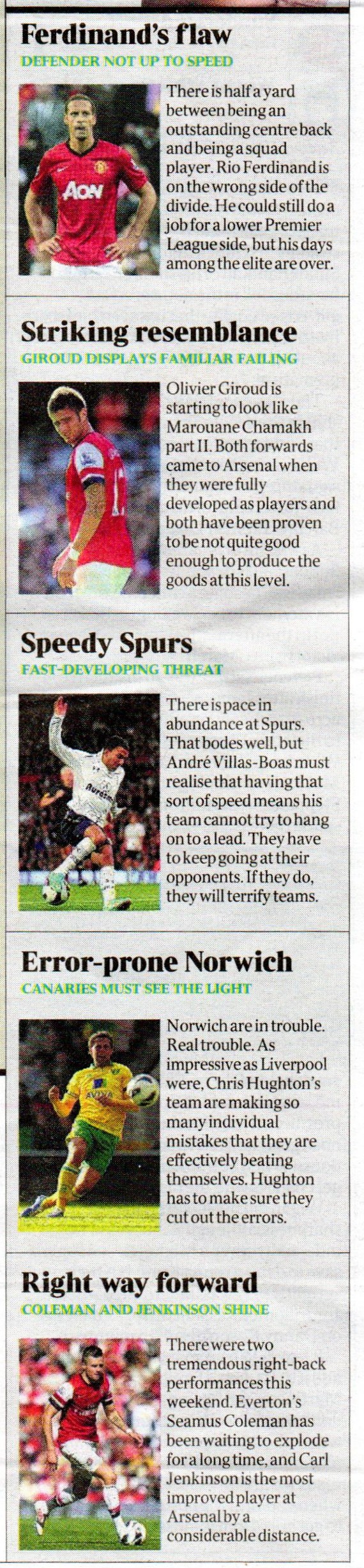 However, they do employ the odd person who should consider himself lucky to have a job at all. One such is Tony Cascarino, erstwhile Irishman and now ‘expert’. Cascarino dishes out what he calls The Tony Awards, in which he usually states something fairly obvious that can’t be argued with too much. This week: Rio Ferdinand is a bit slower than he used to be and thus not so effective at top level; Spurs have lots of pace, so they need to use it to attack rather than hang on to a lead; Norwich make lots of mistakes so they aren’t very good. (Honestly, is there a person of average intelligence in the country who watches any football who could not have worked these out for himself? Can you even read them without rolling your eyes? I can’t. There is hope for me to get my dream job at The Times yet.)