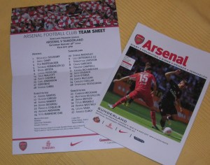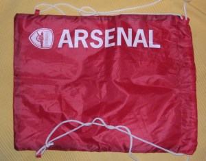 1 Arsenal v Sunderland programme from the first game of this season  (note: You can actually buy these), with 1 teamsheet from Arsenal v Sunderland, as issued to the press and rich people in boxes, and as used to see what the teams were. (Possible to buy if you know someone who has one.)1 Arsenal / Save The Children ‘sports band’. You can definitely buy these; that is in fact their sole purpose, to get money for the charity. I’m a maverick, so I’m giving it away anyway, but don’t let that stop you from donating to Save The Children.1 Arsenal drawstring bag, invaluable for keeping ‘stuff’ in. Not particularly big or heavy stuff, as it is only about 42 cm by 33 and made of nylon. However, this you CAN’T buy. You can’t buy it because it’s a sample piece of merchandise that the powers that be have decided won’t go into production. So you – yes, you – could be pretty much the only person in the world – that’s THE WORLD – with one of these to keep your small relatively light stuff in. It features, as you can see, the word Arsenal in big letters and the club crest.The pièce de resistance, as Arsène would say:
