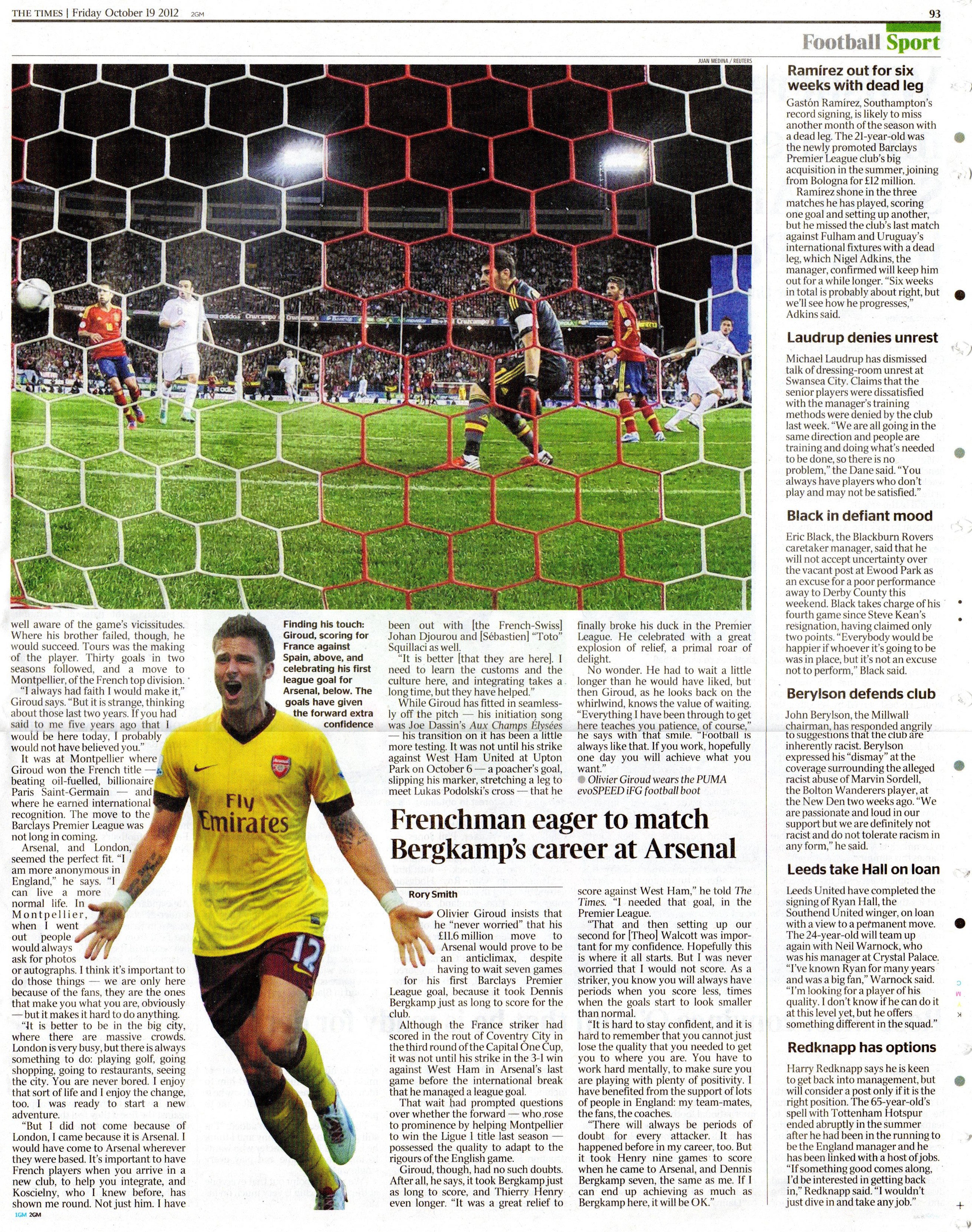 Below the main feature is a smaller piece headed “Frenchman eager to match Bergkamp’s career at Arsenal”. Naturally the comparison only comes about because of the similar length of time it took the two of them to score a league goal; Giroud is not so daft as to believe he is as good as Bergkamp. Clearly he isn’t. The question remains, though, whether he is good enough for Arsenal. The Times come to no critical conclusion, but I’m still in the camp that believes he can be a useful and effective Arsenal player, but only if we play to his strengths. At the moment our forward play lacks any focus. The defence has improved this season, horrendous individual errors aside, and attack is where the manager needs some fresh ideas. Giroud could be a star or a £12m write-off by the end of the season. I think the conclusion depends a lot more on what Arsène Wenger chooses to do with him and those around him than what he can control himself.