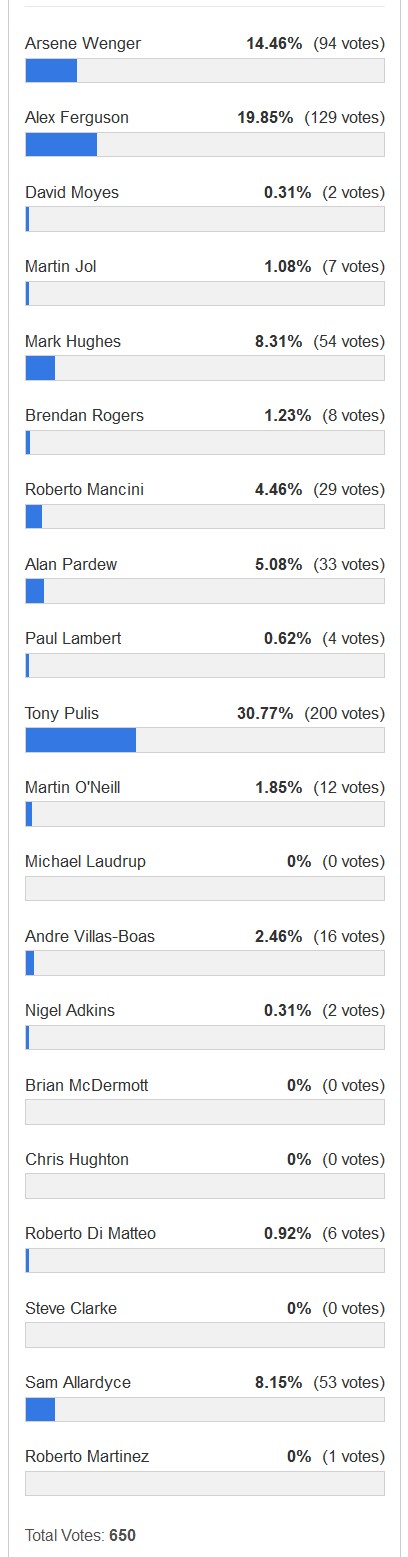 I think those who have received most of the votes have got them for different reasons to each other. Pulis’s team play unattractive football, and of course there is the Shawcross incident, the baseball cap and the pronouncements of Pulis himself. Fergie probably just got most of his votes for winning so much, but signing RvP won’t have helped. Arsene is now seen by a proportion of Arsenal fans to be holding the club back, and his apparent stubbornness and resistance to change doesn’t help, not to mention the recent run of generally poor results.
