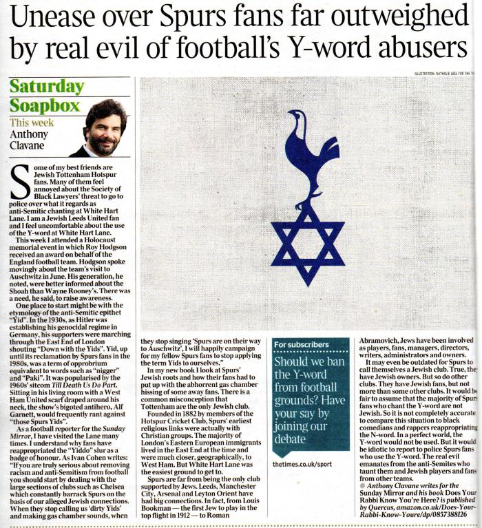 Back to the point. Spurs fans call themselves the ‘Yid army’; some fans of other clubs call Spurs fans ‘Yids’ in a derogatory way; some quite high profile people want to stamp out both of these, in the same manner that similar terms for other races are now not socially acceptable. Sunday Mirror football writer Anthony Clavane (who is Jewish and a Leeds fan, he tells us) wrote the piece below on this subject for The Times last weekend, and a very similar piece by the same author was posted on the Daily Mirror’s website.