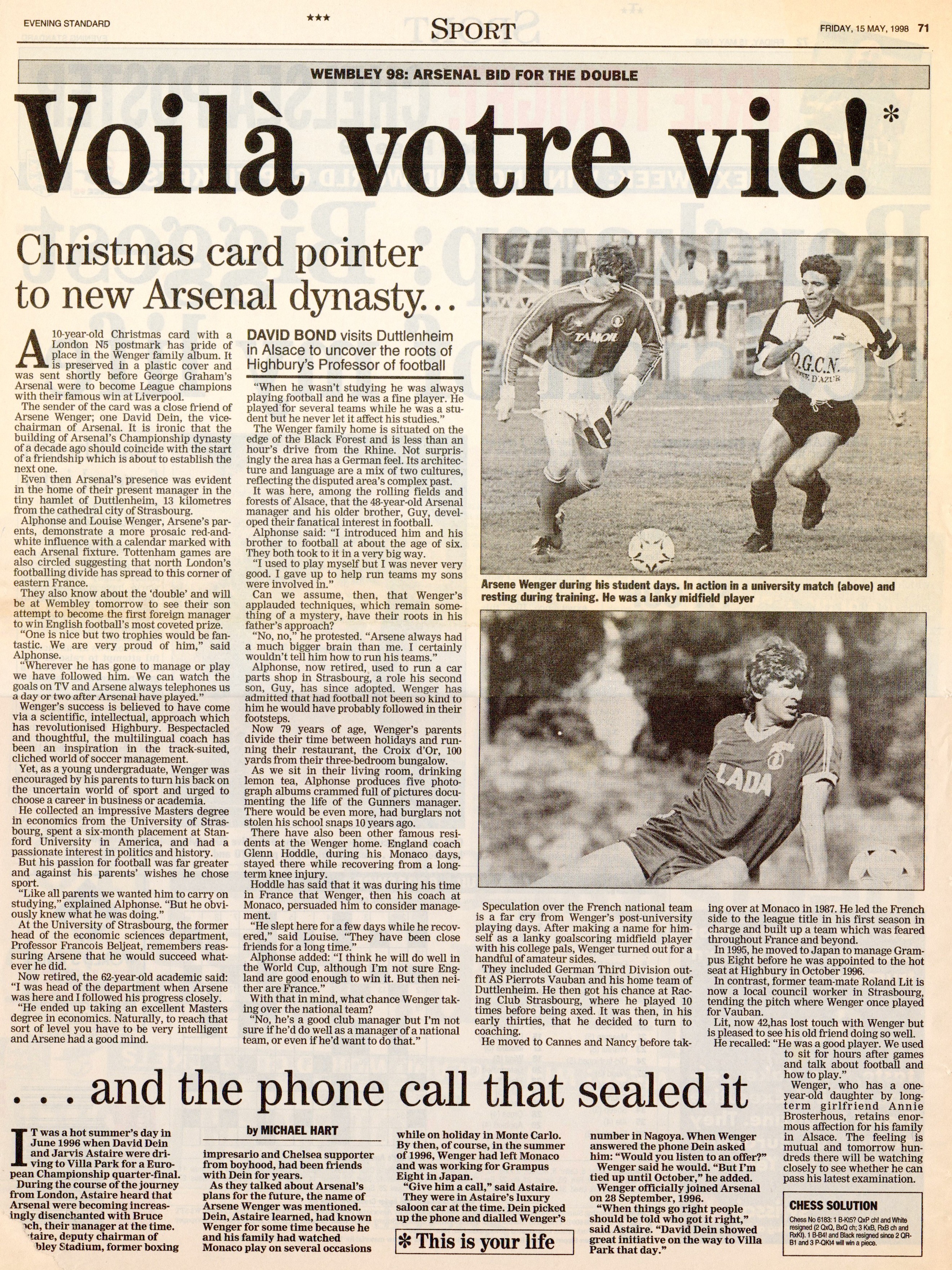 I found this article from the Evening Standard in 1998, as Arsenal were about to win their second Double, and first under Arsene Wenger. It’s a delve into the Frenchman’s background and family, with a couple of pictures of the young Arsene as a footballer in his student days.