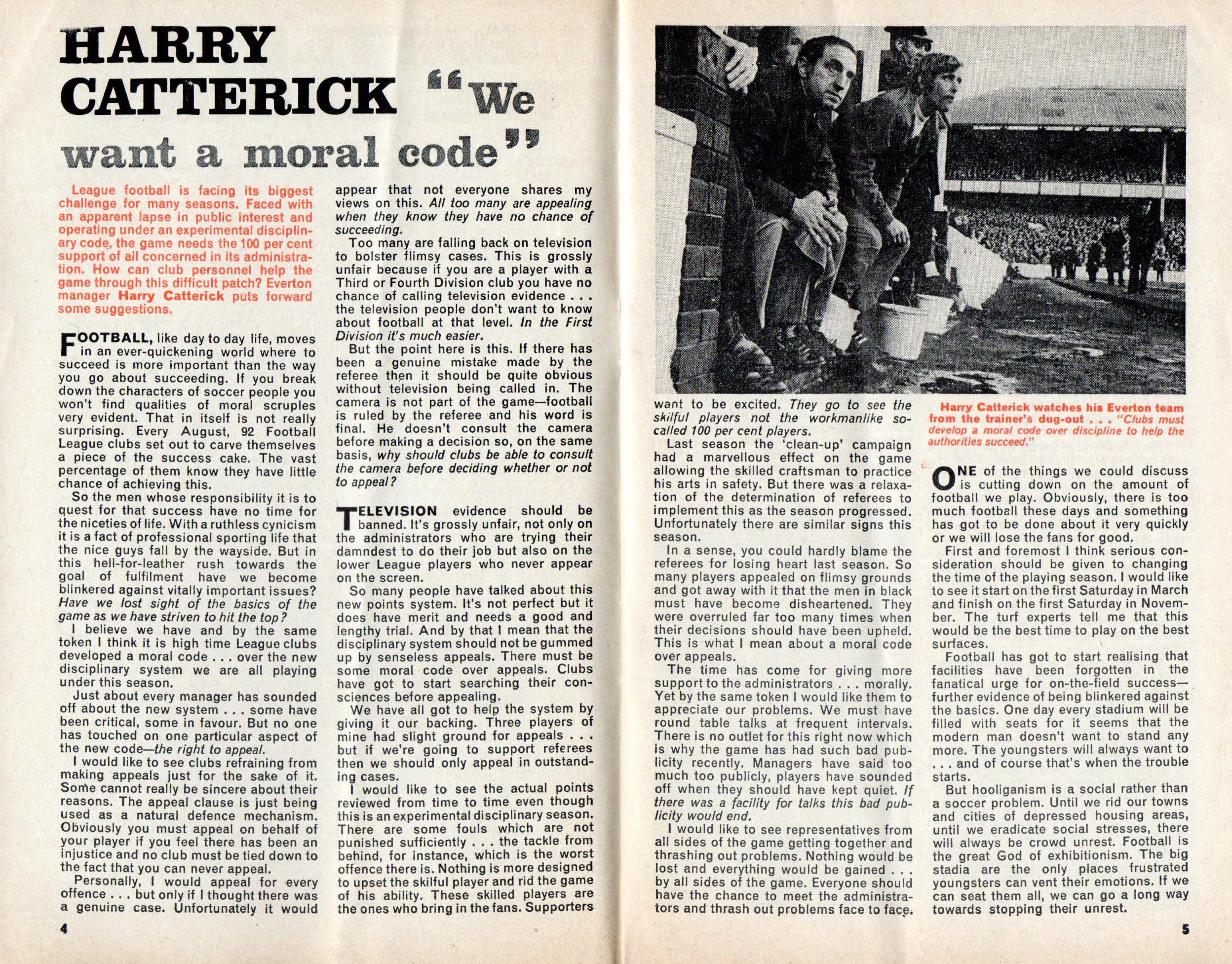 Slightly more sensibly than Mr Jennings, there’s a piece by Everton manager Harry Catterick suggesting moving the season to be March to November, which would improve the notoriously bad playing surfaces of the time. Catterick also majors on the new phenomenon of TV evidence being used in appeals against referees decisions, which he doesn’t like – though to be fair it was the number of frivolous appeals that he hated most.League Review 1972 Harry Catterick002