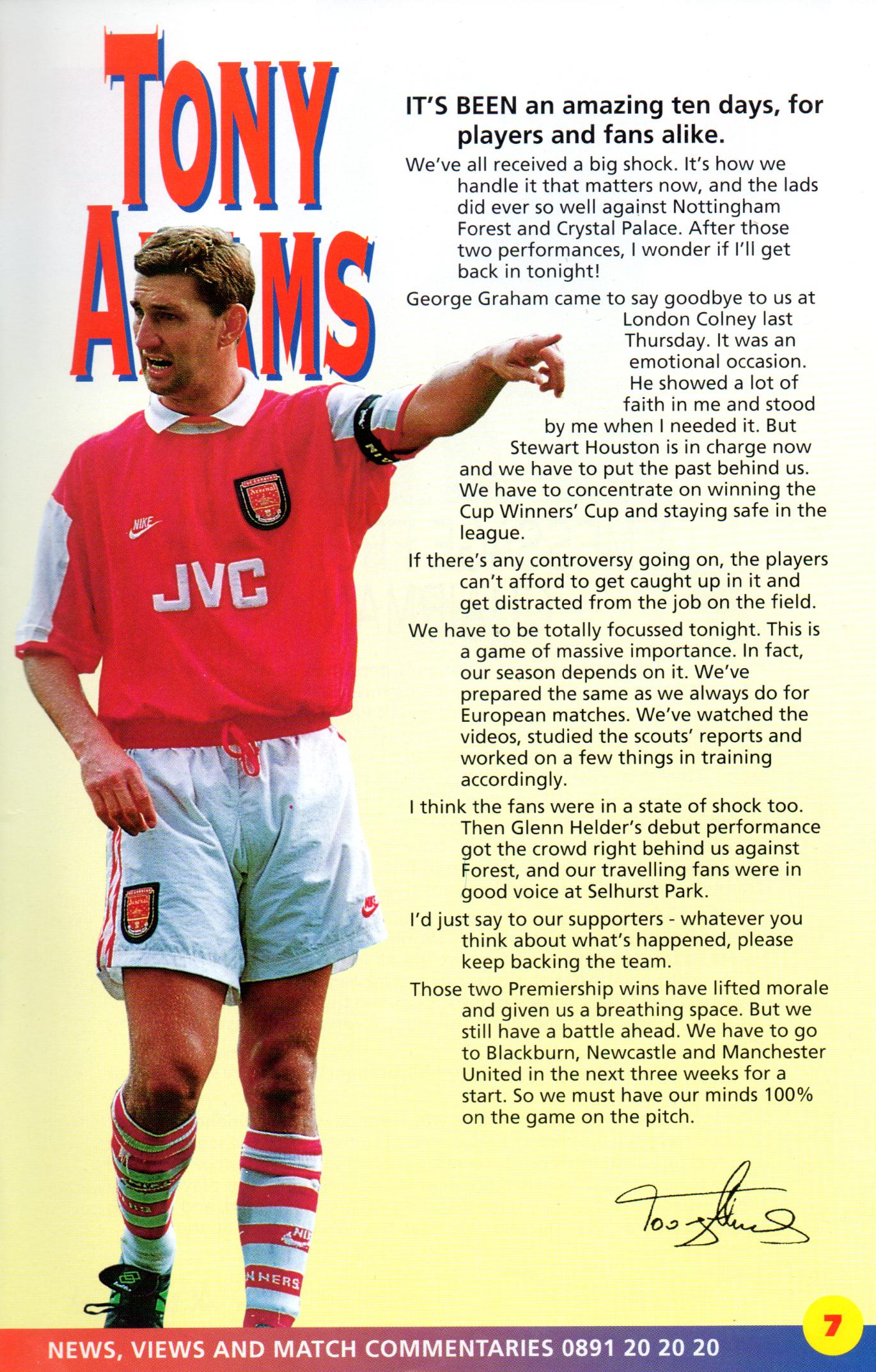 Tony Adams on his regular Captain’s page gives his old mentor a mention, then gets on with the business of telling everyone to focus. He also refers to “staying safe in the league”, which demonstrates how far things had fallen since winning the league only four seasons earlier.
