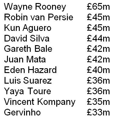 £50m is a lot of money. Only Fernando Torres and Cristiano Ronaldo have ever been bought or sold by British clubs for that amount or more. Let’s refer to the (supposed) experts at transfermarkt.com. They reckon that the most valuable players in the PL at present are these:transfermarkt most valuable Feb 2013