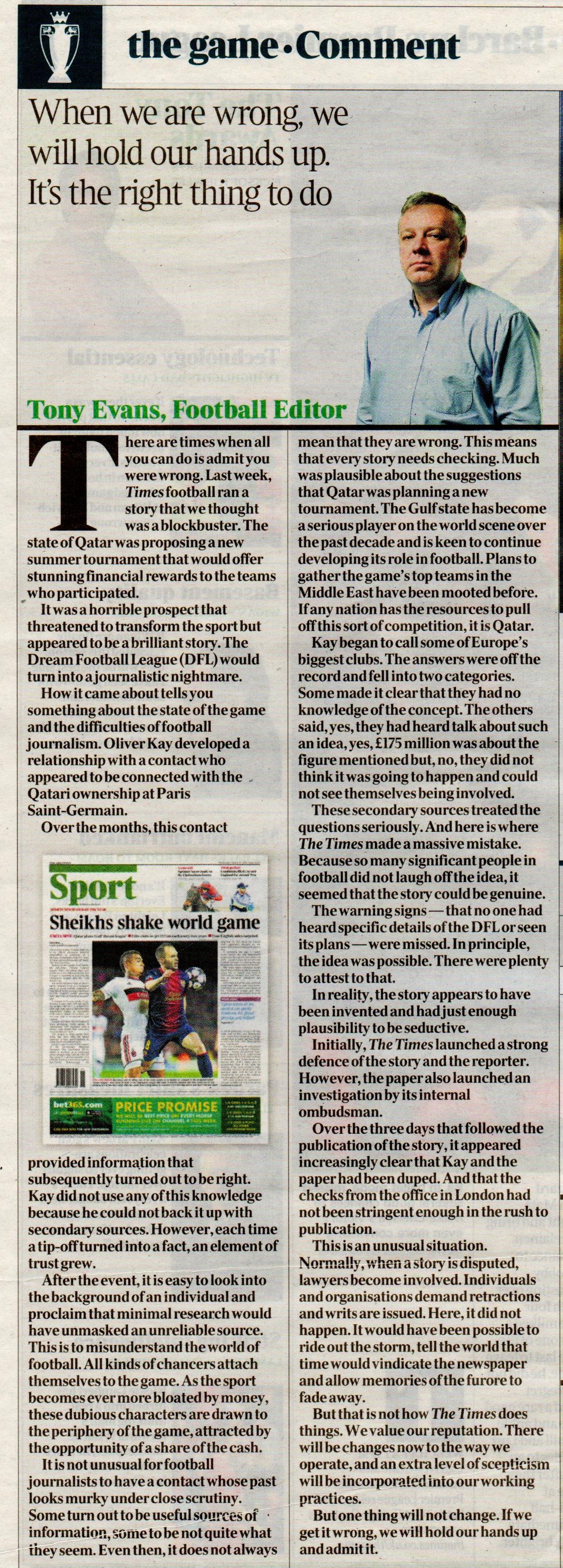 As you may know, I’m a big fan of The Times. They do excellent features about all sorts of things I’m interested in, not least sport. But they’re not perfect, as they admitted this week with their 600 word apology for the story about the supposed Qatar ‘Dream Football League’, where the top clubs in Europe would decamp to the desert every other summer for a kickaround in the sand, pocketing £175m each for the pleasure.Times apology 18Mar2013