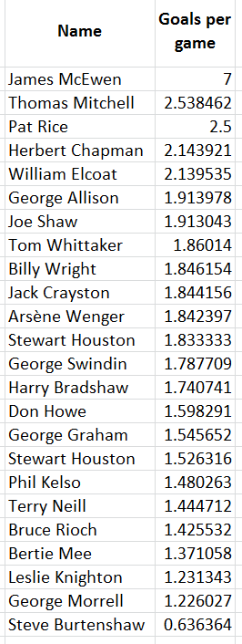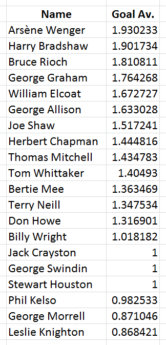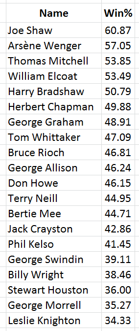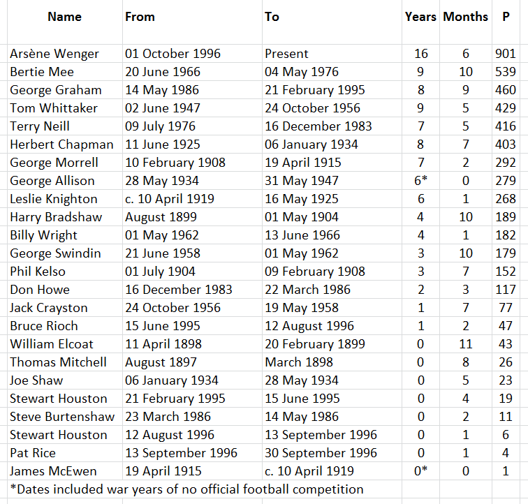 James McEwen was in charge for one competitive game at the end of the 1914-15 season, the last game before football was abandoned until the end of World War I, where Arsenal beat Notts Forest 7-0. Arsène Wenger is surprisingly far down the table, below such unsuccessful managers as Billy Wright and Jack Crayston, as well as Chapman, Allison and Whittaker. Strange when you consider that the football produced for several years was world-beating for entertainment value. The less said about Steve Burtenshaw the better.
