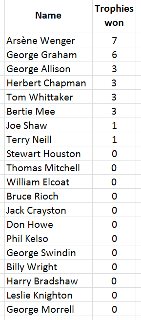 Joe Shaw walks it of course, but Arsène is a lowly fourth. If he’s still there in May 2017 and still hasn’t won anything else, Herb will also overtake him in this table.