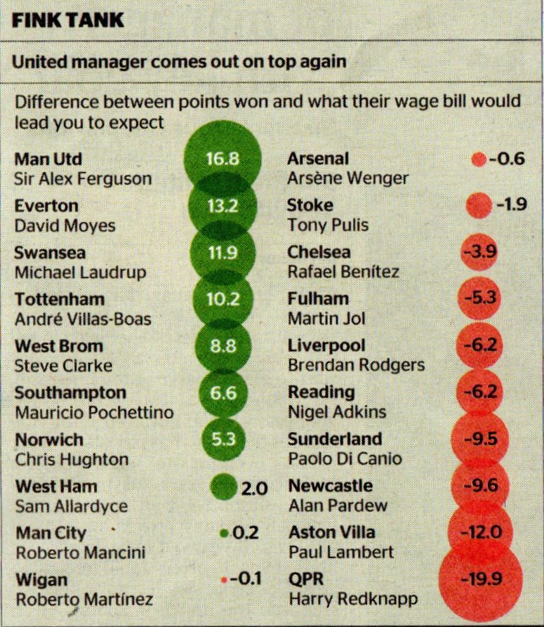 One thing is sure: we are certainly nearer to a couple of teams with much smaller wage bills than ours than we are to Man Utd. But then neither Chelsea or Man City are very close to Man Utd either, and their wage bills are bigger. What does that tell us? Clearly that some managers perform better than others, and in the absence of a spending cap or the implementation of my brilliant idea to get all the managers randomly swapped around to different teams in the Premier League the day before the season starts, we can only measure manager performance on how many points they should be expected to get for their budget.