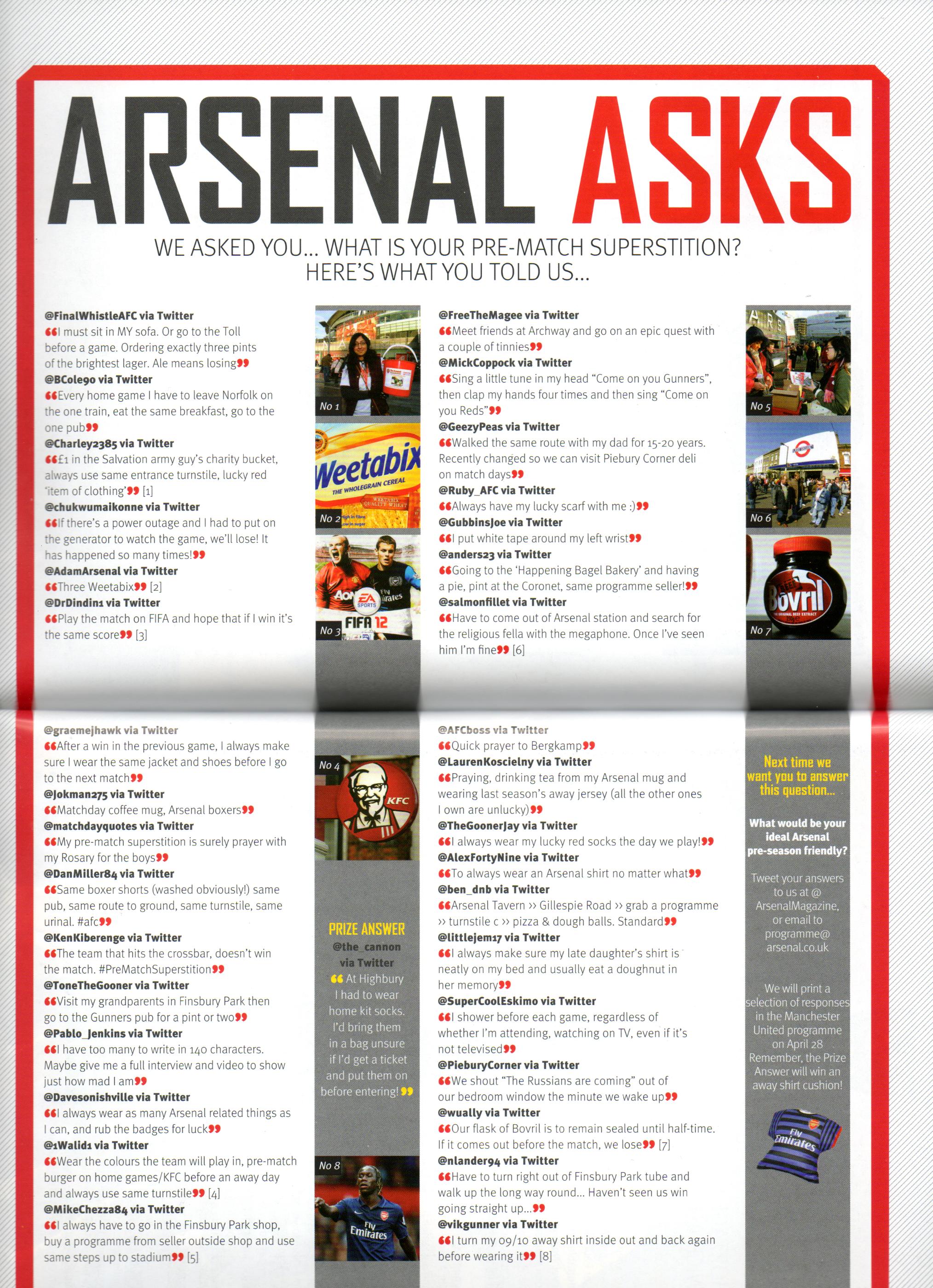 Firstly, there are two pages of pre-match superstitions that fans have tweeted in. Leaving aside that a few of them look completely made up (“We shout ‘The Russians are coming’ out of our bedroom window” – oh yeah? Do you really?), are there genuinely this many people who think that their actions have any bearing on the wider world? I bet if you asked these superstitious people what they think of religion they’d mostly say, “Oh I don’t believe in that rubbish.” And yet they fondly imagine that they – not even a mystical higher power, but them in person – are making a difference to a completely unconnected event by going to the same pub or wearing the same shirt. As Denis Leary used to say, ‘I think you hear me knocking, and I think I’m coming in.’