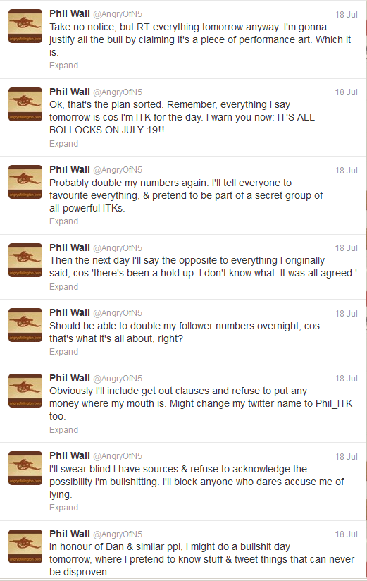 On Thursday I sent a few tweets pointing out the ITKs methods. The initial response when I suggested I might become ITK myself for a day was mostly ‘Yes, do it!’, so I thought I would. 1Obviously you need to read those from the bottom up, due to the way Twitter displays things.