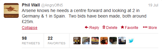 2345678I got a lot of replies. Most people had seen my tweets from the night before and played along with the joke. Some hadn’t and took things seriously. A lot of things were retweeted. I actually found that things that spread round most quickly are bits of info that leave a bit of mystery – like saying a bid has been made for a player, but not naming anyone. As you can see, the tweet below got retweeted 98 times: