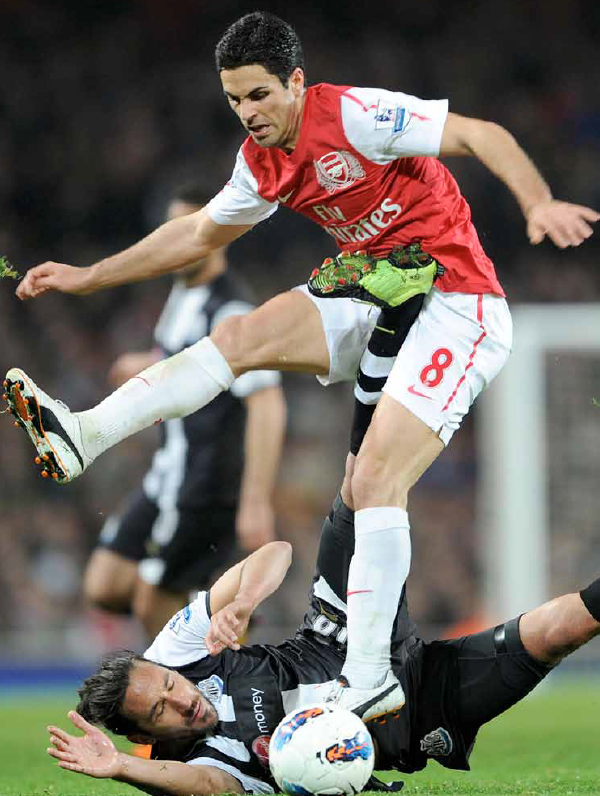 Switching now to the more defensive-minded players in our midfield: one such player is Mikel Arteta. Initially regarded by many as one of the infamous panic buys, Mikel has shown such determination and commitment that he has risen to the position of vice-captain in only two years. As many info-graphics have shown, Arteta made more passes, has greater passing accuracy and more touches every 90 minutes than Michael Carrick, who was nominated for the PFA player of the year award. With comparisons to Xavi and Pirlo, Arteta will continue to show his class for Arsenal. arteta oof