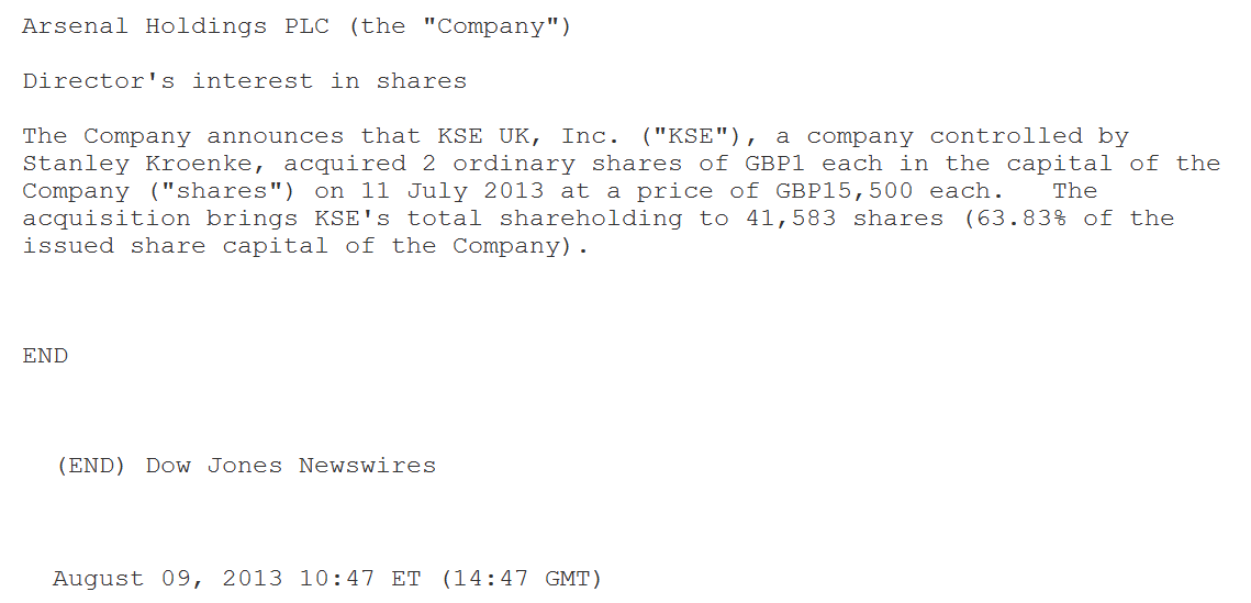 This is odd, I thought to myself. Stan is a Director, and is therefore obliged to make a stock market announcement ‘without delay’ any time he buys or sells a share. I checked the ICAP website, where Arsenal shares are listed: no announcement. I tweeted about it, to mild interest, but had no information as to when the transaction took place.