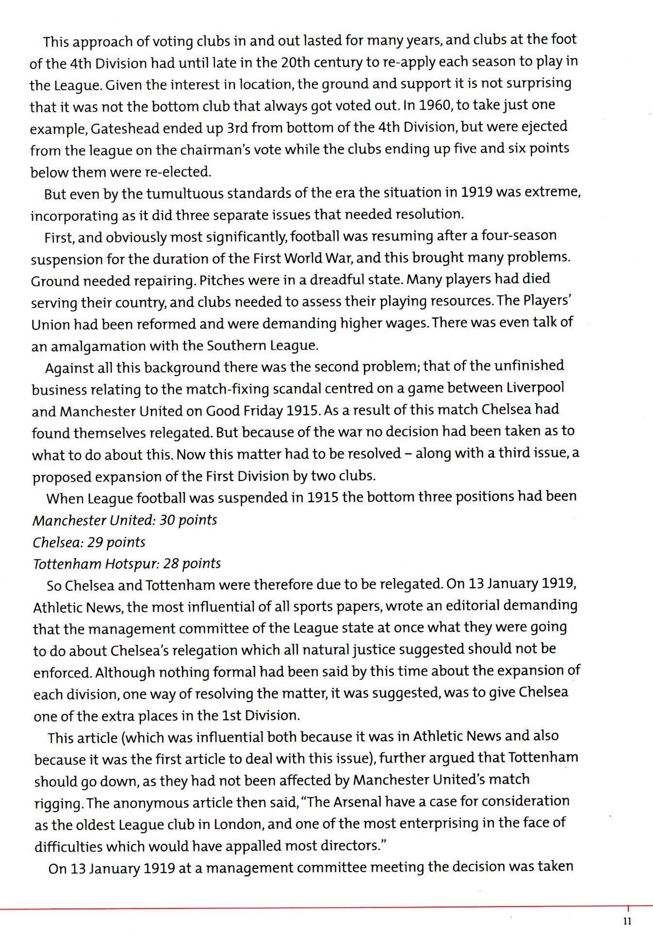 - firstly it’s very likely that many or even most of the chairmen believed Spurs should go down as they’d finished bottom; there was no precedent for the bottom club to stay up since automatic relegation had begun, and Chelsea in second-bottom only escaped without a vote because of the match fixing above them. If that is the case, and a majority decided immediately they were not voting for Spurs, then what Norris would need to do would be to come up with reasons why Arsenal should be elected ahead of their Second Division rivals