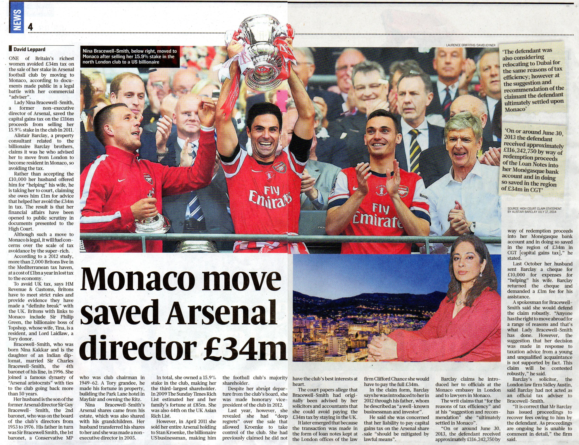 Here’s a piece from The Times a few weeks ago, just for your interest. Our old mate Lady Nina Bracewell-Smith, former director of Arsenal Football Club, the first and only female and probably the first person of non-British origin ever to sit on the Arsenal Board, has upped sticks and gone to live in Monaco. Coincidentally this happened just in time for her to avoid paying £34m tax on the £116m she got from Stan Kroenke for her – well, her husband’s really – approximately 16 per cent stake in Arsenal.
