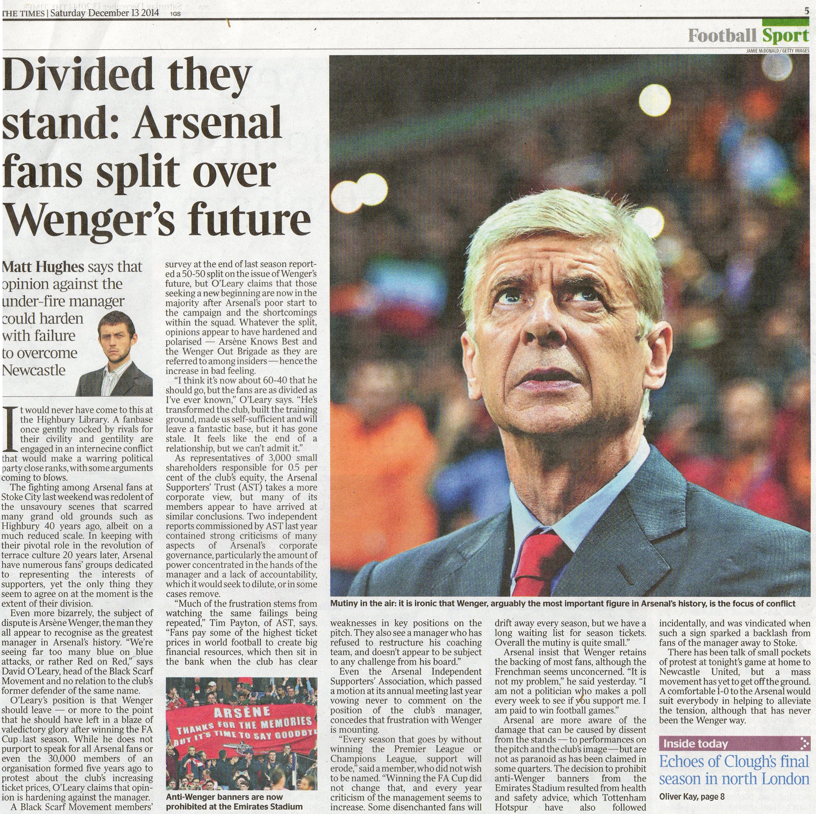 Here’s a piece from The Times on 13 December looking at the attitudes of us fickle Arsenal fans. Matt Hughes at least tried to get some sense out of the supporter groups rather than go on his gut instinct and a misguided belief that being a journalist he is qualified to write on anything.Matt Hughes The Times on Arsenal fans divide 121214