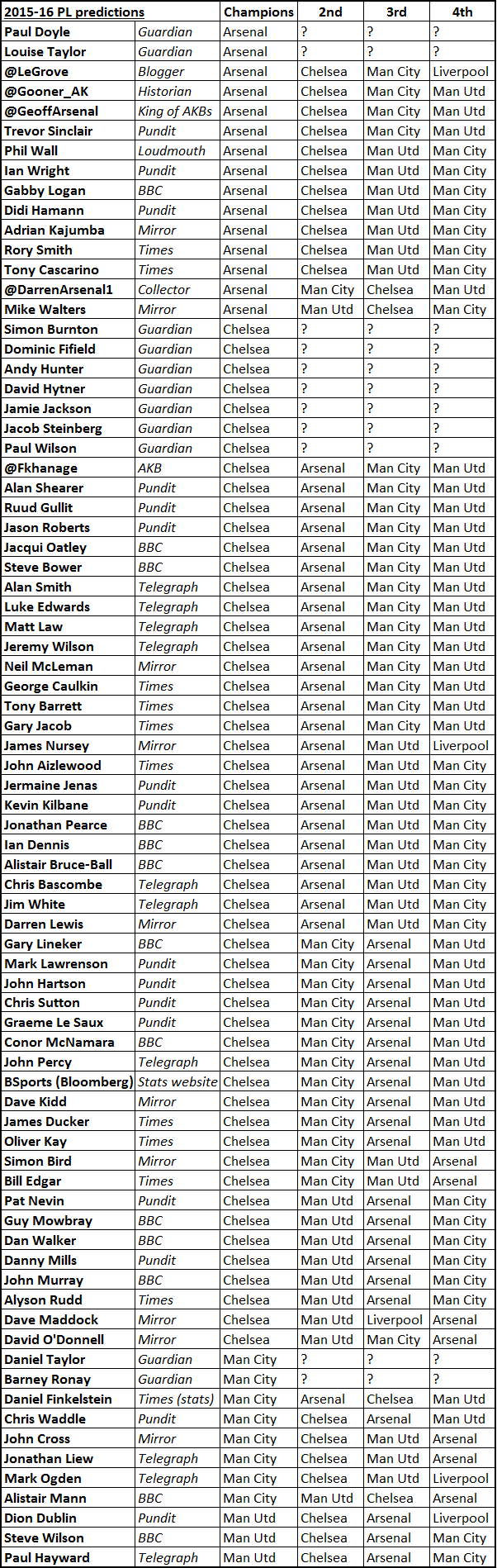 The Guardian journos only predicted a champion, not a whole top four. The Telegraph did predictions, but on a video that contained no clues as to who was speaking, if, like me, you have no idea what different Daily Telegraph journalists look like. Sky Sports are stuffed with ex-players who are normally keen to give opinions but unlike last year I couldn’t find a list of their predictions.