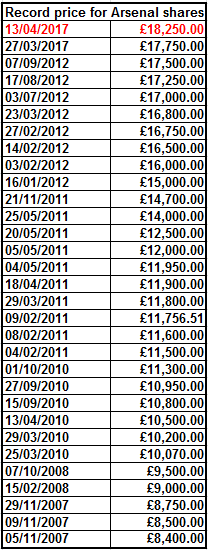 Well bugger me with a fishfork. The record price for an Arsenal share wasn’t broken for five years and now it’s been smashed for the second time in a couple of weeks.