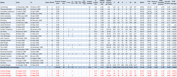 - For several early managers, I have put major trophies available as zero, as their predecessor would not have left them in a position to win anything during the time they had in charge. For example, taking over with Arsenal in the Second Division means no immediate chance of winning a League title. In practice this makes no difference in most cases, as Arsenal’s first major trophy wasn’t till 1930 anyway! You could argue a new manager might also be affected by his predecessor leaving a very weak team, so realistically he might be unlikely to win the league first time even if given a full top division season. Conversely, you could argue the likes of Joe Shaw and George Allison could barely lose in their first seasons, given the bang up job Herb had done before them. In a sense, Arsène Wenger disadvantaged himself by always qualifying for Europe – if he didn’t, he’d have fewer trophies to go for. There’s no perfect method of measuring everything, I’ve just tried to do it fairly and consistently.