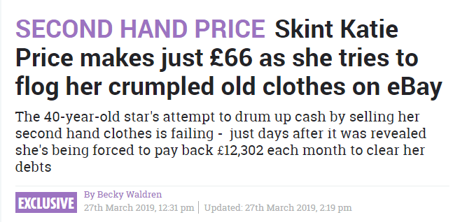 2018 (and continuing in 2019) – Katie Price narrowly avoids bankruptcy and is forced to sell personal items for a few quid on ebay.