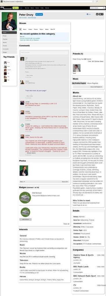 Somehow Drury seems to have developed the idea that people tune in to football matches he’s commentating on, not because it is the only channel showing that particular match so there’s no alternative, but because they want to listen to him. When he was at ITV I did think that maybe he realised that ITV’s sports coverage in general and football coverage in particular were so utterly and depressingly piss-poor that they make hospital radio sound like Orson Welles reading Churchill’s diaries adapted by Stephen Fry, and thus he was trying to make it up to us, the suffering public, by being entertaining. I might, if in an especially good mood, be prepared to give him the benefit of the doubt and conclude that he’s a decent fellow at heart who is trying to be entertaining but unfortunately comes across as a total berk. Against that is the evidence of his MySpace page.