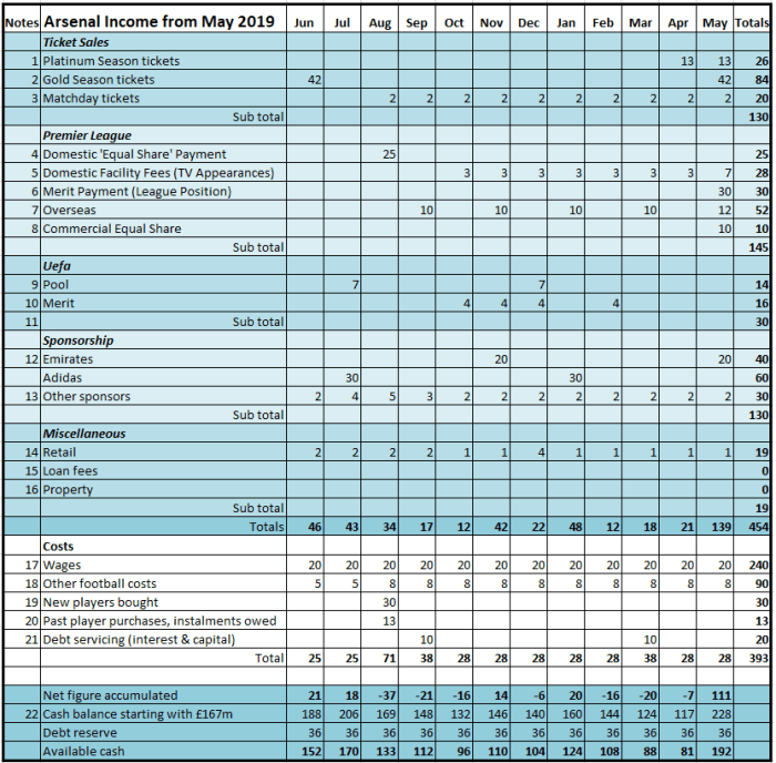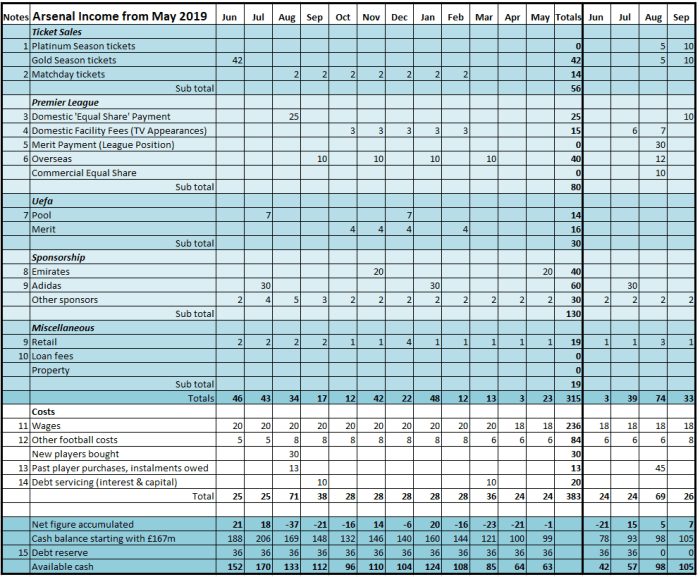 I realised I was underestimating sponsorship money with the uplift from Emirates and the Adidas deal being much more lucrative than the previous Puma deal. This means that the current cash situation is likely to be better than I’d thought, so I’ve amended the tables below. This raises the possibility of a small net transfer spend, though there will still be a large hole in the finances later next season if the usual £90m+ of ticket money doesn’t arrive.