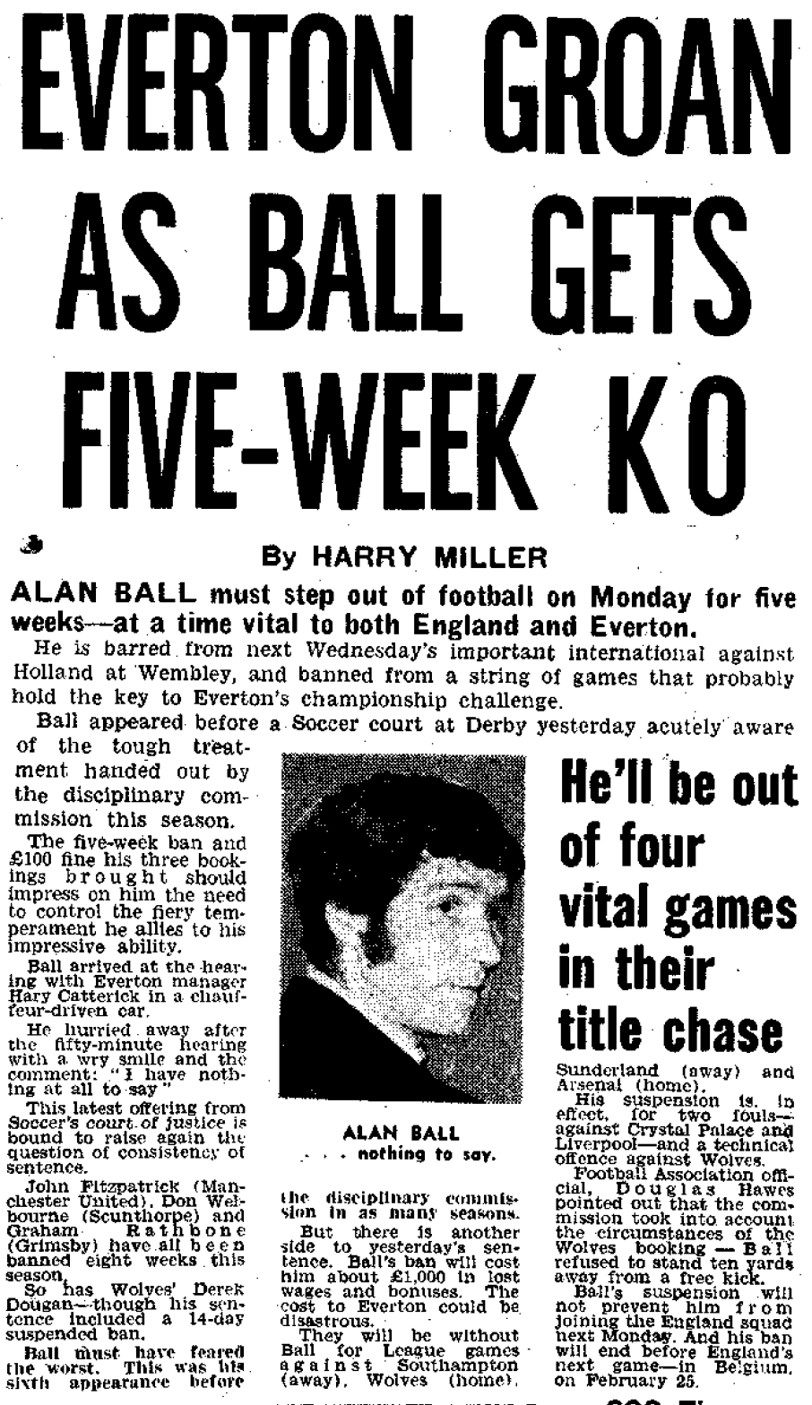 Alan Ball (Everton): 5 weeks and £100 for three bookings collected in 3 separate matches in 1969-70 season; he missed four league games and an England international, and was reported to have lost around £1,000 in wages and bonuses.