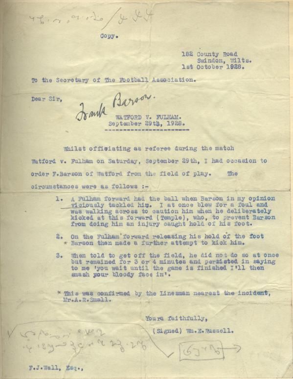 Frank Barson (Watford): 6 months for allegedly kicking an opponent, 1928. The offence was denied by both him and the opposing team, but the ban stood in spite of this and a 5,000 signature petition presented to the FA. I have been sent this letter by someone on twitter calling themselves Jimmy Catton (@cattoncollect), which is apparently from the referee of this match to the FA, reporting the incident. You can read about the real Jimmy Catton here.