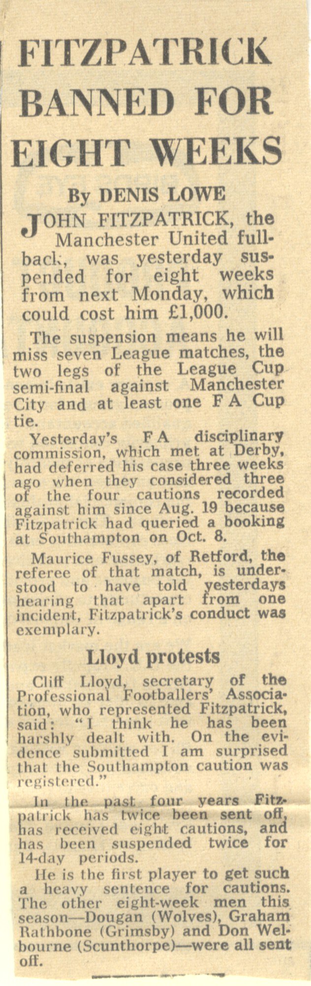 Kevin Lewis (Man Utd): 5 months, after being sent off in a Central League (reserve) game, December 1971. He was banned until the end of the season, with the length of punishment being due to previous bans of three weeks in 1969 and then four weeks and a £25 fine in January 1971. He was in the Man Utd first team squad for 1970-71, but never made a first team appearance.
