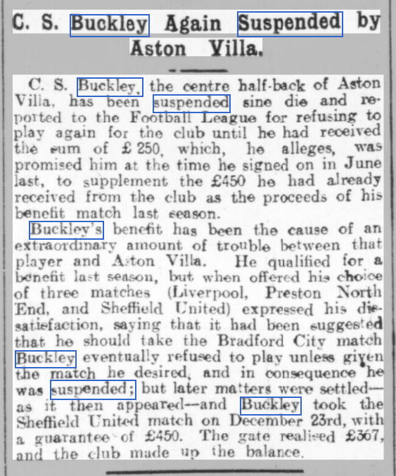 Chris Buckley (Aston Villa): 1 year and 7 months and a fine of £24 for refusing to play, 1912. Buckley had been offered a benefit match by Villa in 1911, but was unhappy with the choices of potential opponents, believing there’d be higher gate receipts from the match Villa were due to play against Bradford City. At the time these benefit matches tended to be regular fixtures rather than specially arranged friendlies, and the player would be given the gate receipts. He refused to play as a protest and was suspended by Villa, but in the end he accepted the receipts from a match against Sheffield Utd on 23 December 1911 and resumed playing. The receipts totalled £367 but he’d been guaranteed £450 so Villa made up the rest. However, the following summer he refused to sign his contract unless he was paid a further £250, which – according to Buckley – the Villa vice-chairman then promised him. The money was not forthcoming, so come the new season in September Buckley again refused to play, despite having signed. Villa said that he was in breach of contract, suspended him indefinitely and reported it to the League. The League commission decided Buckley’s demands were illegal and suspended him until April 1914. They also decided Villa paying him while he refused to play was illegal, and fined Villa 25 guineas! When his suspension ended Buckley signed for Arsenal, making 59 appearances and scoring 3 goals between 1914 and 1920. Obviously these numbers would have been far higher were it not for the four seasons lost to WW1. Cutting below from the Sheffield Daily Telegraph – another story unearthed by Arsenal historian Andy Kelly (@GoonerAK).
