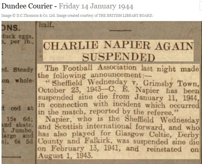 Charlie Napier (Sheffield Wednesday): 2 years and 4 months for various on-field offences, 1941. Napier was registered to Sheffield Wednesday but during the war returned home to Scotland and guested for Falkirk, where the offences took place. The FA took a dim view despite him being north of the border, and banned him indefinitely in February 1941. The ban was removed in June 1943, but he was again banned between January 1944 and August 1945. When the war ended the FA allowed him to return to Wednesday, but as it turned out, they no longer wanted him and he ended up at Stenhousemuir.